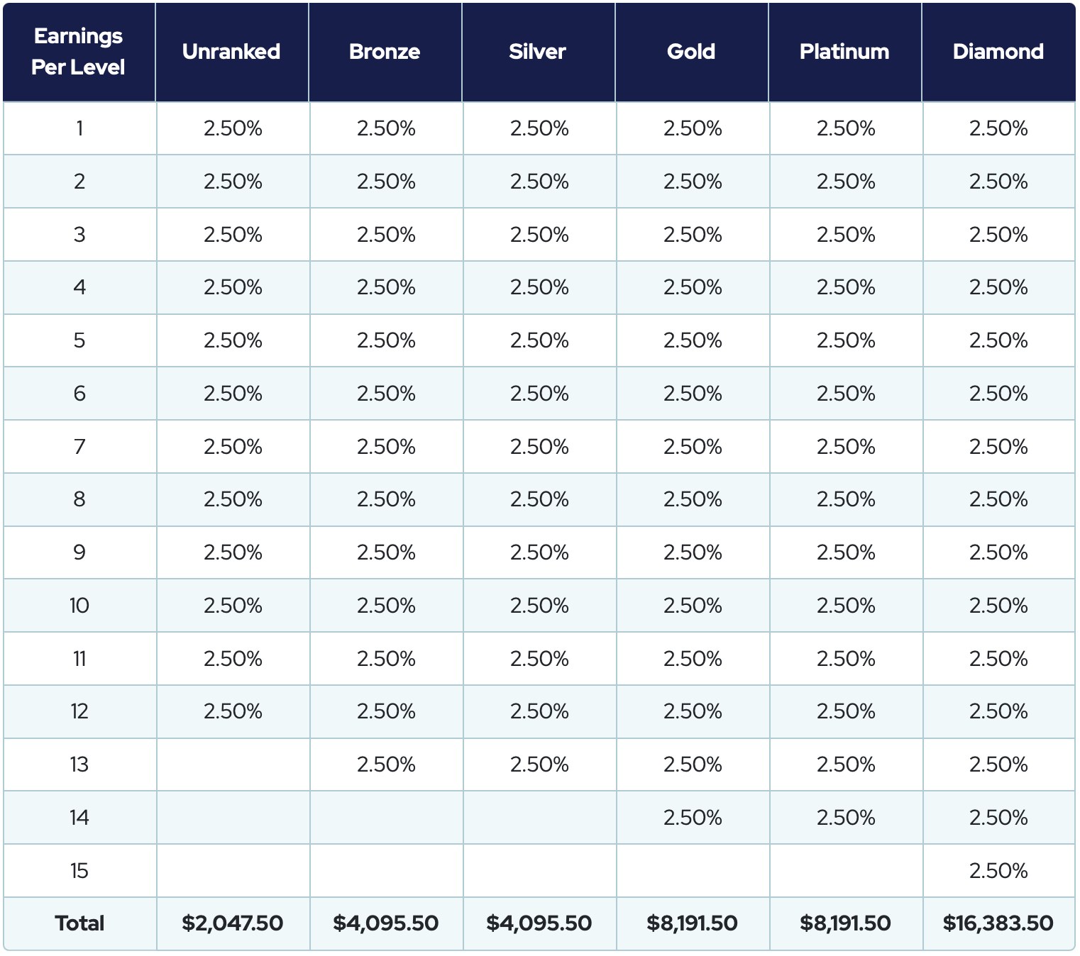Pe lângă cei $2,047.50 și până la $16,383.50 pe care îi poți încasa din Matricea personală, vei încasa până la 50% din Matricea comisioanelor celor pe care tu îi înscrii, Și un procent din tot ceea ce înscriu acele persoane, 5 GENERAȚII DE ÎNSCRIERI ÎN ADÂNCIME, indiferent unde sunt aceste persoane în Matrice!