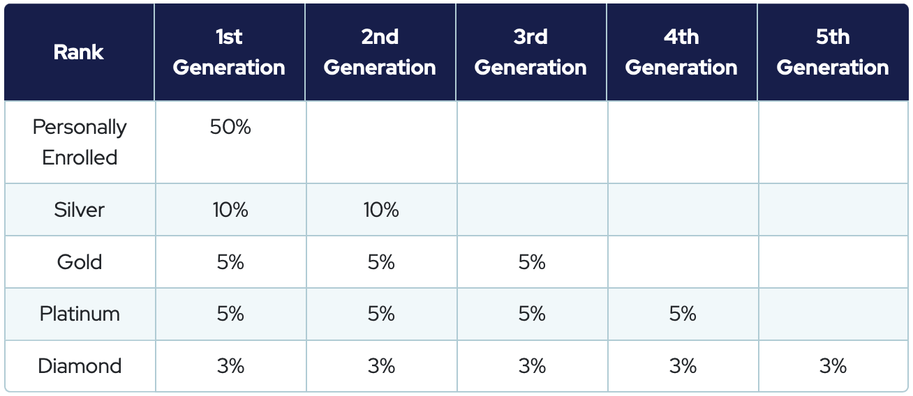 Dacă ești de exemplu Platină, de exemplu, vei lua de asemenea diferența de generație de Gold si Silver. Așadar dacă cineva din a 2-a generație este Silver, sau poate fi prima generație de Gold, și poate fi prima generație de Platină, deci tu ai putea încasa 10% pentru a 2-a generație de Silver, 5% pentru prima generație de Gold, și 5% pentru prima generație de Platină din întreaga Matrice a persoanei!